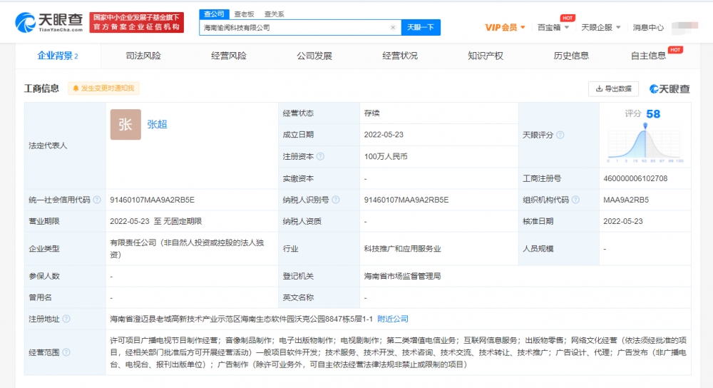 5月23日,海南愉阅科技有限公司成立,法定代表人为张超,注册资本100万人民币,经营范围包括广告设计、代理;广告发布;广告制作;广播电视节目制作经营;电子出版物制作;电视剧制作;第二类增值电信业务等。股权穿透图显示,该公司由北京抖音信息服务有限公司(原北京字节跳动科技有限公司)间接全资控股。